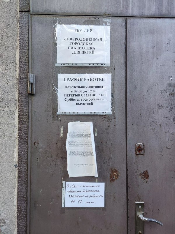 В оккупированном Северодонецке Луганской области местная "власть" "открыла" детскую городскую библиотеку. Ну как "открыла" - график работы весит, но помещение закрыто на ремонт.