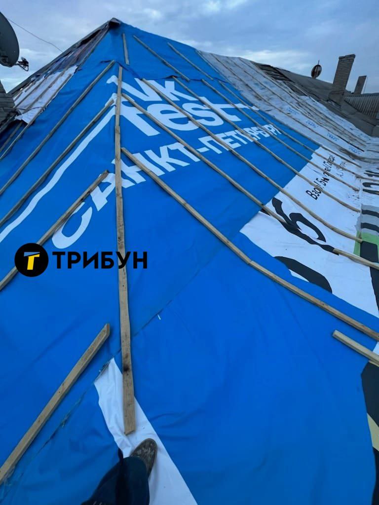 На снимках видно, как оккупационные силы вместо проведения качественных ремонтных работ просто застилают поврежденные крыши привезенными плакатами с рекламных бордов. Очевидно, этот несложный подход не только придает домам небрежный вид, но и абсолютно неэффективен в вопросе восстановления изоляции и защиты от непогоды...