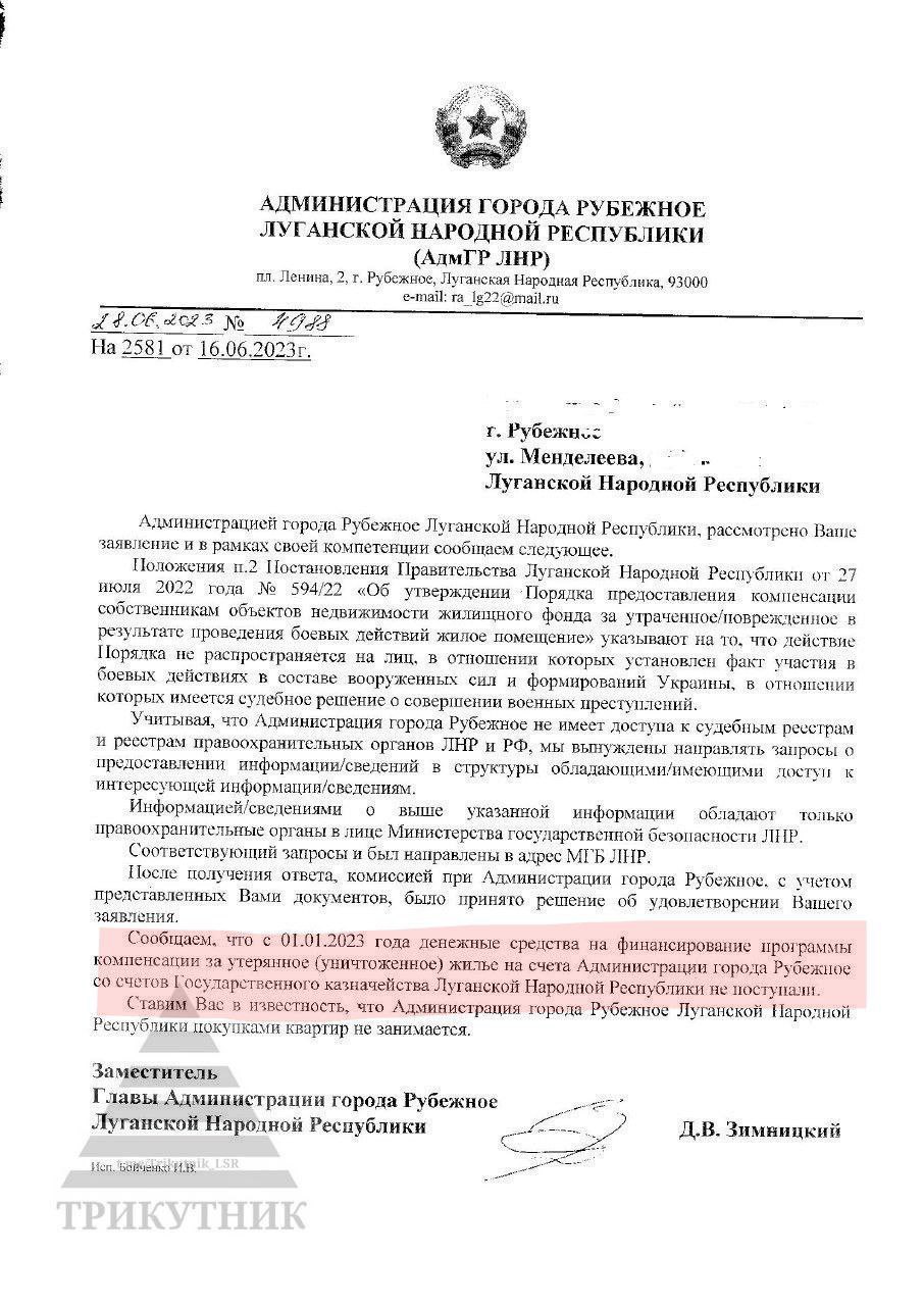 На заявление местного жителя относительно утраченного жилья, так называемая "администрация" города ответила отказом.
