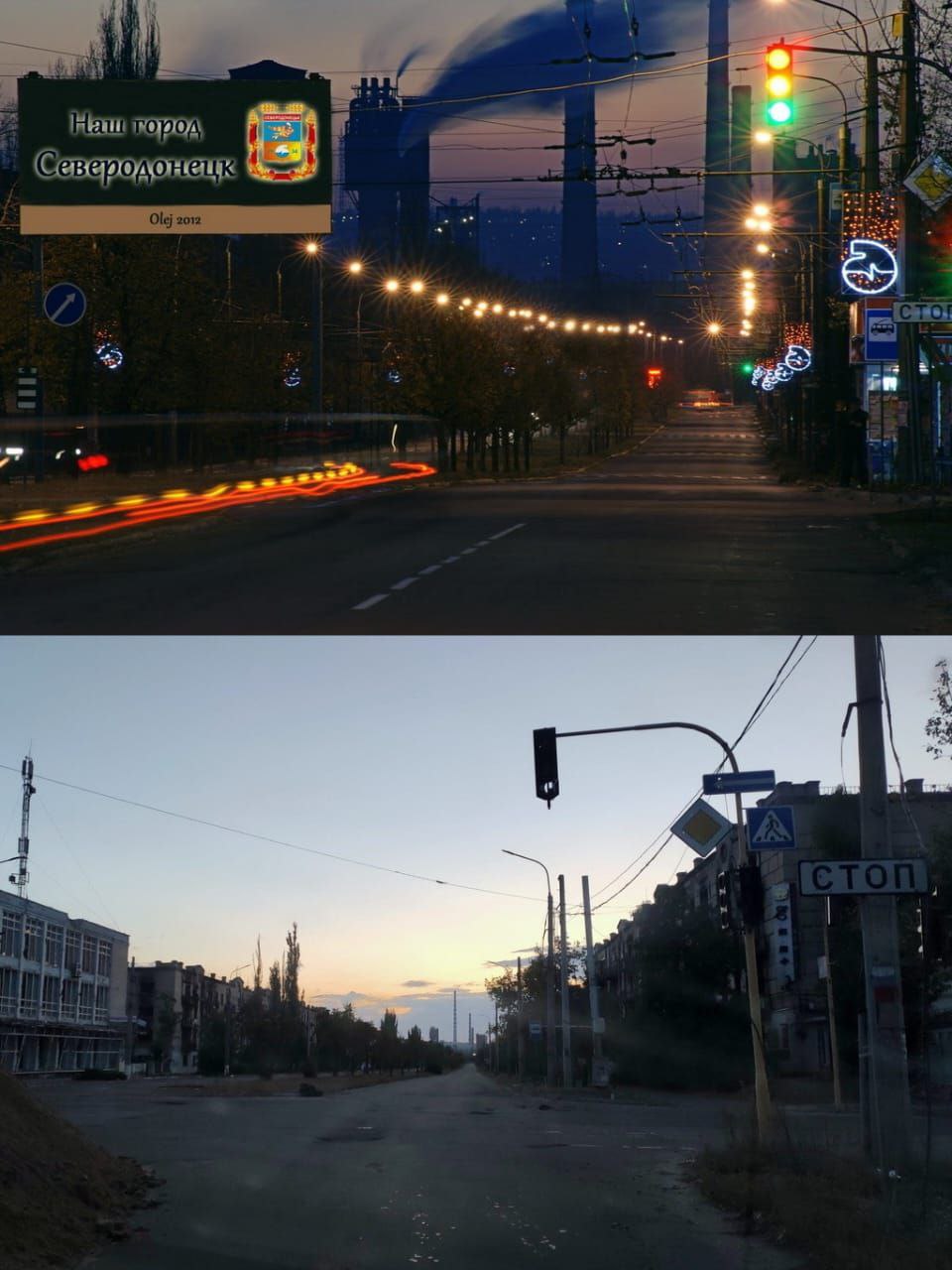На двух фото изображено одно и то же место - проспект Химиков. Но на первом - Северодонецк, каким его помнят горожане, а на втором - "освобожденный" оккупантами Северодонецк. Уличного освещения, движения, людей больше нет. Есть только разруха, совершенно пустая дорога, пустые здания. И, стоит отметить, что на фото не попали разрушения, которые нанесла российская армия в других районах Северодонецка. Тогда бы картина стала еще более печальной.