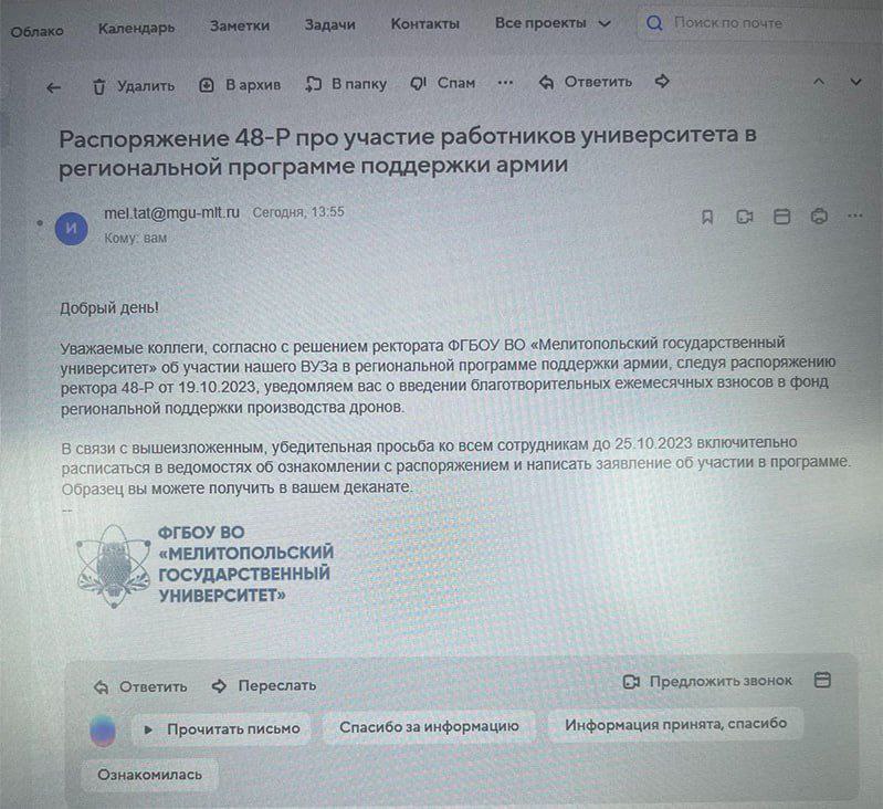 В университете временно оккупированного Мелитополя Запорожской области начинают на добровольно-принудительной основе отчислять часть зарплаты работников на счет "региональной программы поддержки производства дронов".