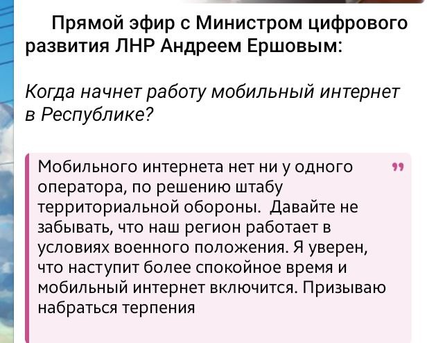 Между тем, "министр цифрового развития, связи и массовых коммуникаций ЛНР" в прямом эфире для общения с жителями оккупированной Луганщины, призвал "набраться терпения".
