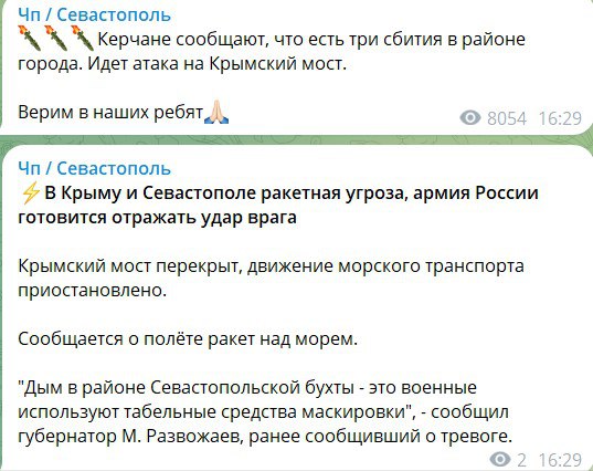 Российские оккупанты объявили тревогу в оккупированном Севастополе и перекрыли Крымский мост, очевидцы сообщают, что мост атакуют ракетами, а над ним дымовая завеса.