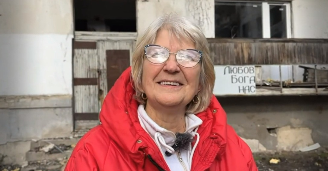 "Нет! Наш дом не очень пострадал", - заявляет северодончанка, стоя у своего покалеченного дома. При этом она заявляет, что "особых трудностей в городе нет".