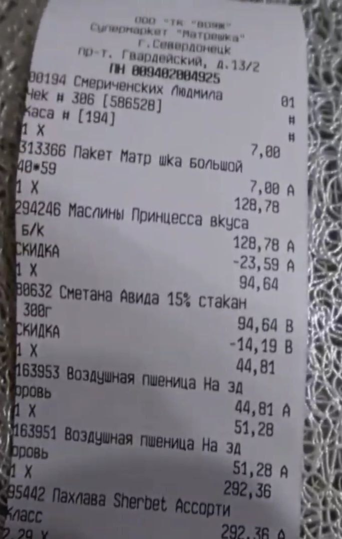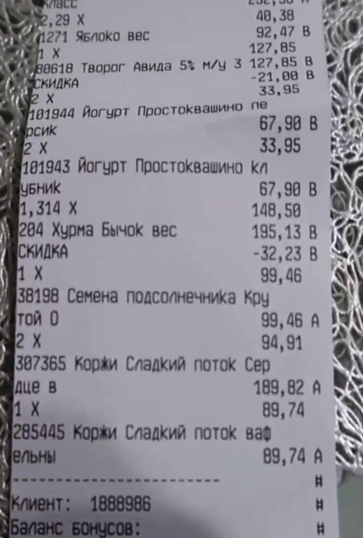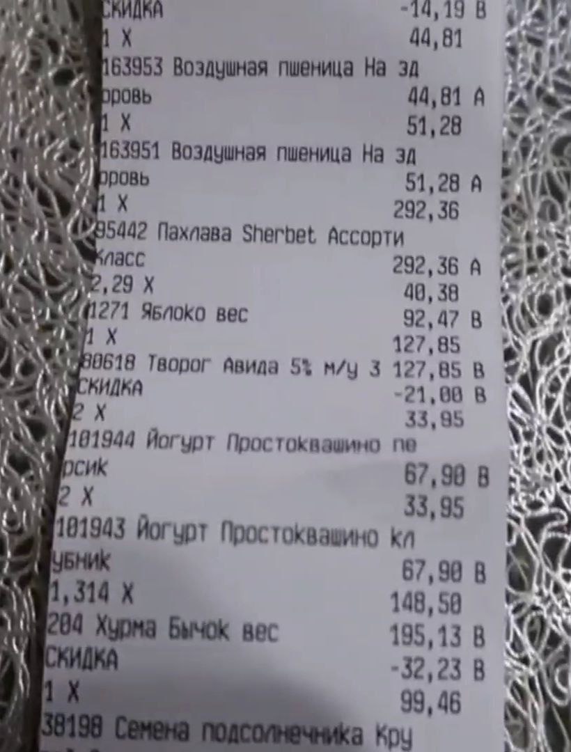 Судя по чеку, покупки были сделаны в супермаркете "Матрешка". Продуктов было куплено достаточно много, общая сумма на изображениях не заметна.