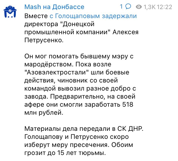 "Обвинения в мародерстве со стороны других мародеров выглядят конечно смешно. Особенно на фоне того, как открыто мародерит в Мариуполе тот самый Кадыров на комбинате Ильича. Видимо, нужно было просто найти крайнего, чтобы повесить на него разграбление города. И нашли лоха Голощапова, которого не жалко и который теперь отсидит за всех", — написал он.