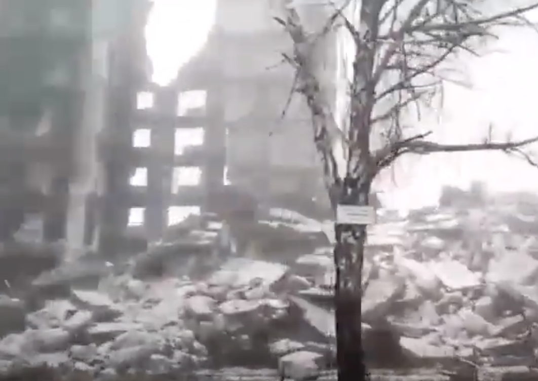 Кадры датированы декабрем 2023 года. На улице следы непогоды, туманно. Но город выглядит катастрофично не из-за погоды, а в результате оккупации и беспощадных обстрелов. Многоэтажные дома в центральной части Попасной уничтожены. В городе трудно найти здание, которое не пострадало бы от обстрелов. Завалы никто не разбирает.