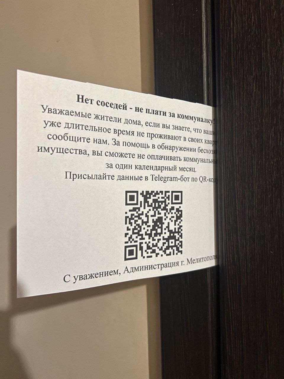 Во временно оккупированном Мелитополе Запорожской области так называемые "власти" придумали новые способы легализации отжима жилья. Соответствующие листовки с "новой схемой" жители города находят в почтовых ящиках и подъездах.