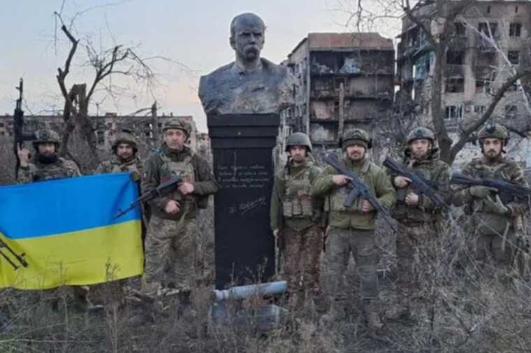 На нем украинские военные стоят возле памятника на фоне разрушенного россиянами города.