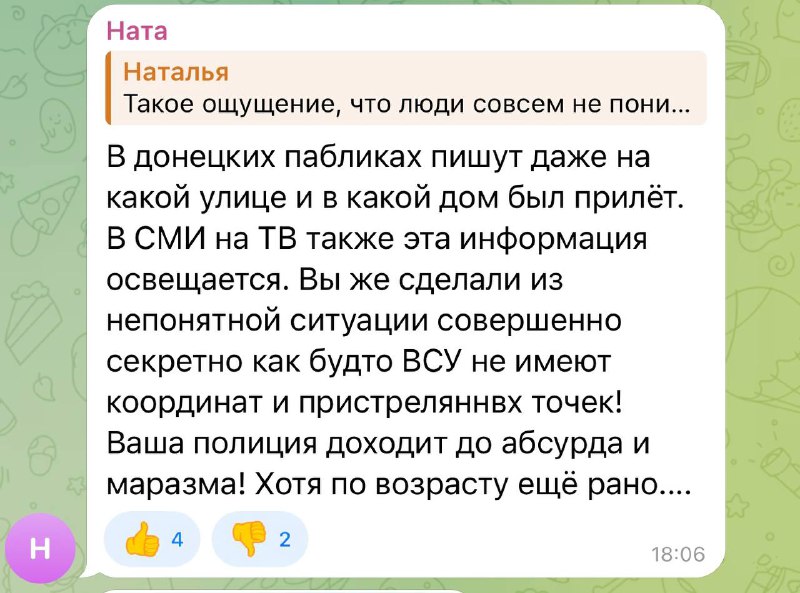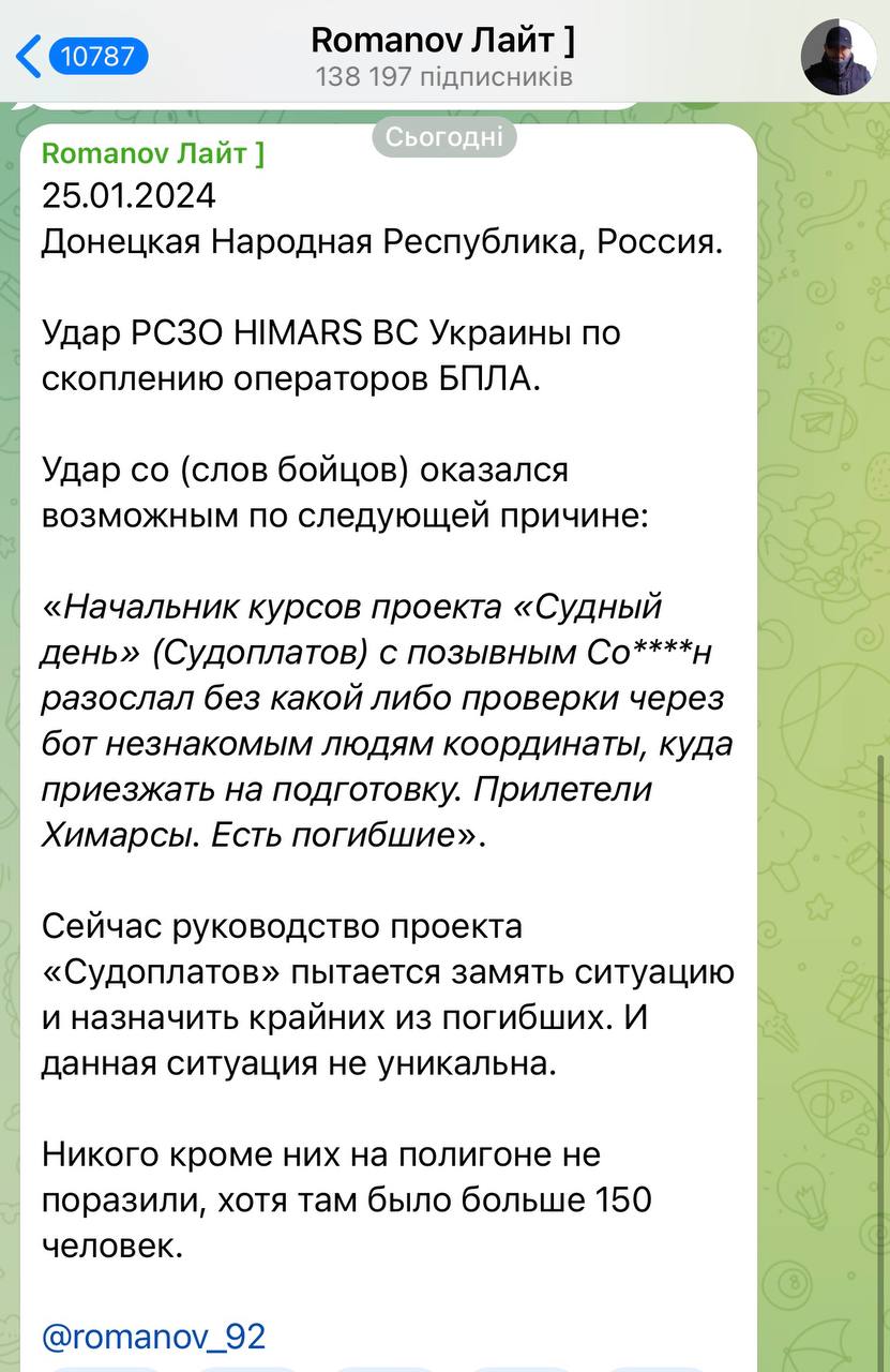 "Сообщается как минимум о 24 погибших. Особенно важно, что уничтожены были операторы БПЛА из "батальона Судоплатова", а не просто какое-то заурядное пушечное мясо. Их проект назывался "Судный день". Ну вот и настал "судный день".