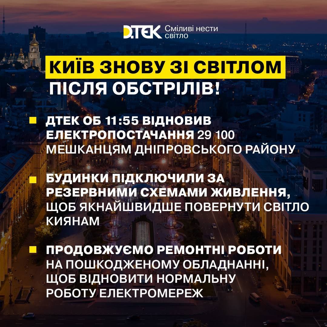 Из-за атаки жители Днепровского района остались без света. Ближе к обеду жителей района снова запитали.