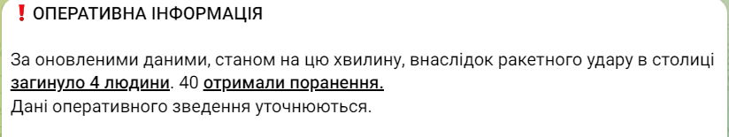 В Киеве возросло количество пострадавших в результате массированной ракетной атаки. Сейчас известно о 4 погибших и 40 раненых.