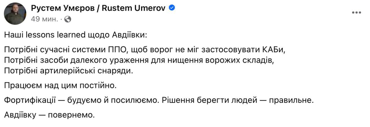 Министр обороны Украины Рустем Умеров назвал в сети уроки, вынесенные из обороны города, передает Час Пик.