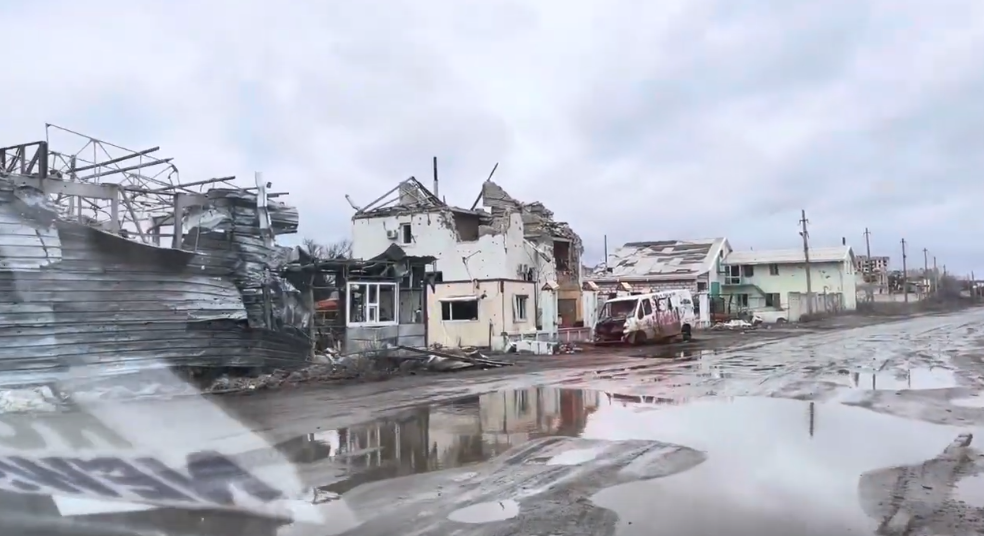 На кадрах видно, что вдоль дороги нет ни одного уцелевшего здания.