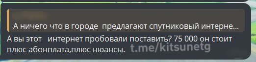 На региональных пабликах также появилась информация, что в городе якобы можно подключить спутниковый интернет. Это подтверждает как и реклама на ТЦ "Кристалл", так и сообщения из местного чата. Пишут, что 75 тыс. рублей стоит его установка. Но есть и нюансы, которые именно неизвестно. Да и как работает сам интернет – тоже неизвестно.