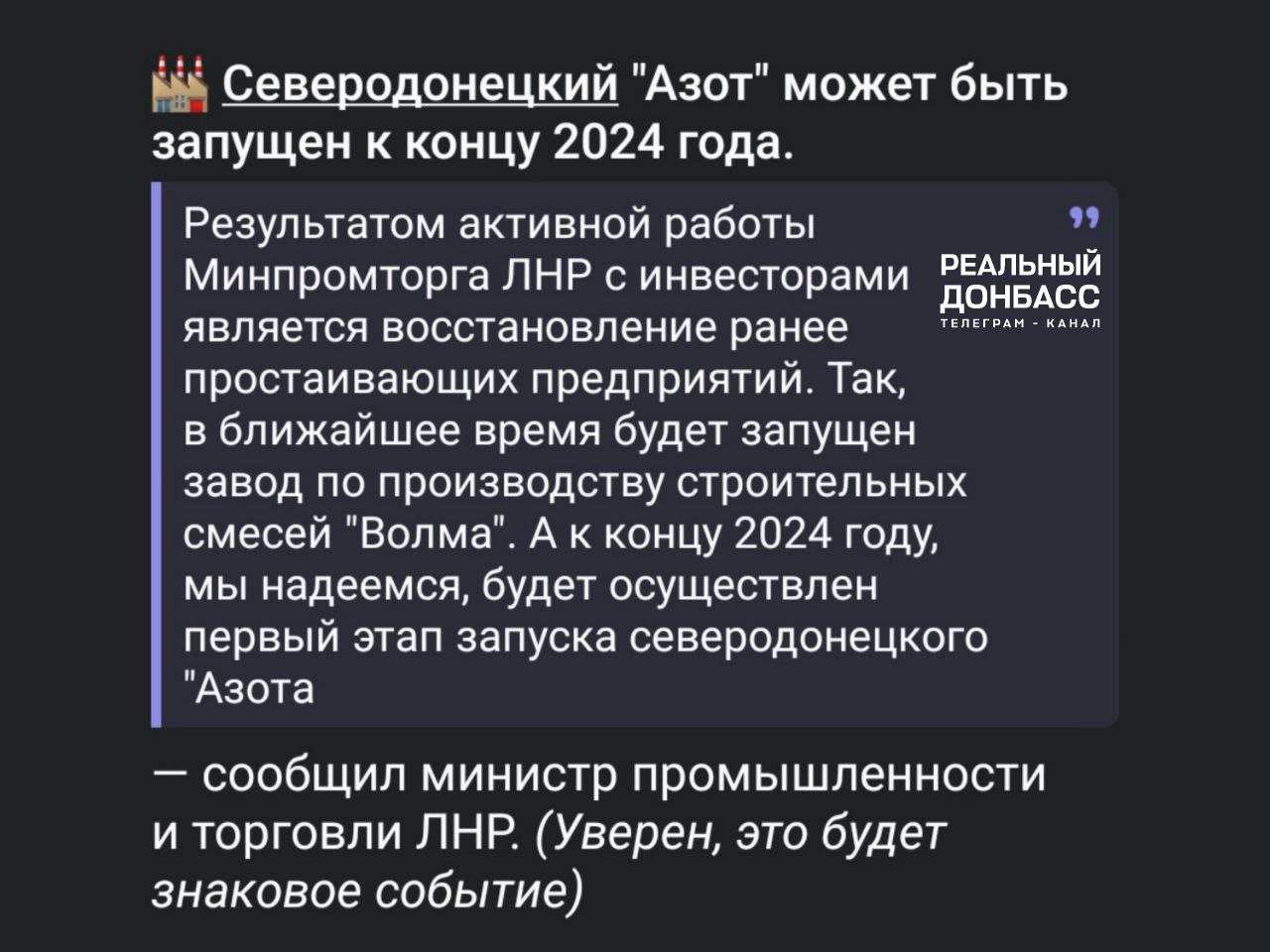 Как пишут оккупанты, "так, в ближайшее время будет запущен завод по производству строительных "Волма".... А к концу 2024 и северодонецкий "Азот".
