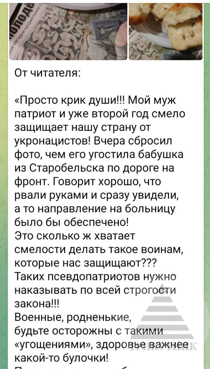 В одном из сообщений пользователь сети рассказала о случае, который произошел с ее мужем, что уже второй год "защищает родную страну" от "укронацистов". Она рассказала и показала, как бабушка из Старобельска угостила вояк по дороге на фронт.