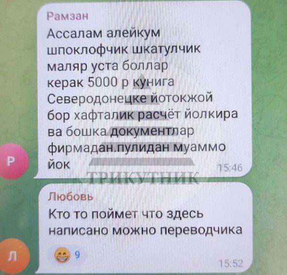 В одном из региональных чатов Северодонецка появилось сообщение, которое привлекло внимание местных жителей. В нем, написанном на смеси русского и узбекского языков, говорится о необходимости работников для проведения ремонтов и других работ в городе. Автор сообщения упоминает, что "рамзаны" (вероятно, работники из Центральной Азии) живут в отжатых квартирах и предлагают свои услуги по восстановлению жилья.