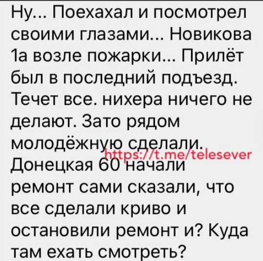 Жители Северодонецка также поделились своими наблюдениями о восстановительных работах в городе. Сообщается, что "на улице Новикова, 1А, возле пожарной части, продолжаются течи в последнем подъезде, несмотря на то, что на Молодежном ремонт уже завершен. На улице Донецкой, 60, ремонт был начат, но, по словам самих рабочих, выполнен некачественно и временно приостановлен".