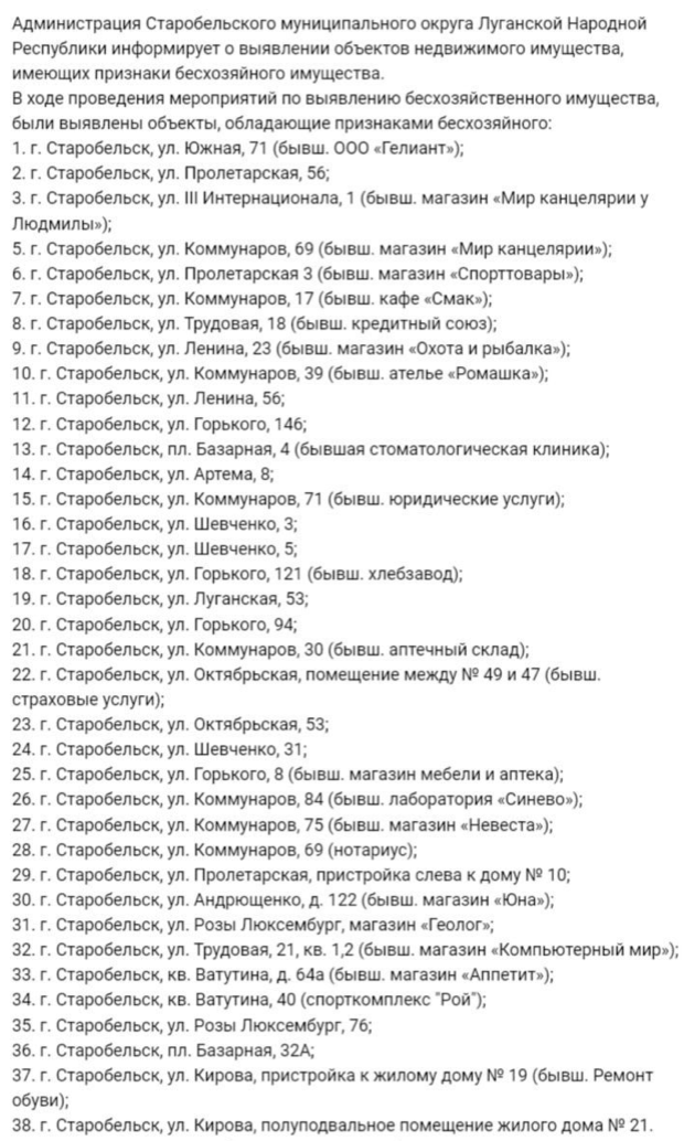 В оккупированном Старобельске россияне обнародовали список магазинов, которые будут "конфискованы" у законных владельцев и наверняка перейдут в "надежные" руки. В перечень попали 38 точек, которые незаконные "власти" посчитали бесхозными после якобы проведения "мероприятий по выявлению бесхозного имущества".