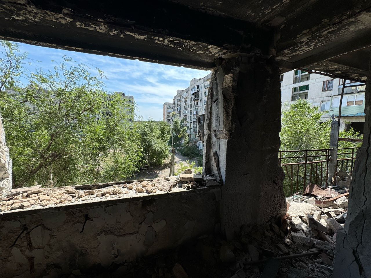 На первом фото видно вид из поврежденного дома, через выбитые окна которого открывается панорама на соседние многоэтажки. Разрушения, обвалившиеся стены и мусор внутри помещения свидетельствуют о том, что этот дом получил серьезные повреждения. Среди зелени виднеются другие здания, уцелевшие частично, но все равно имеющие значительные повреждения.