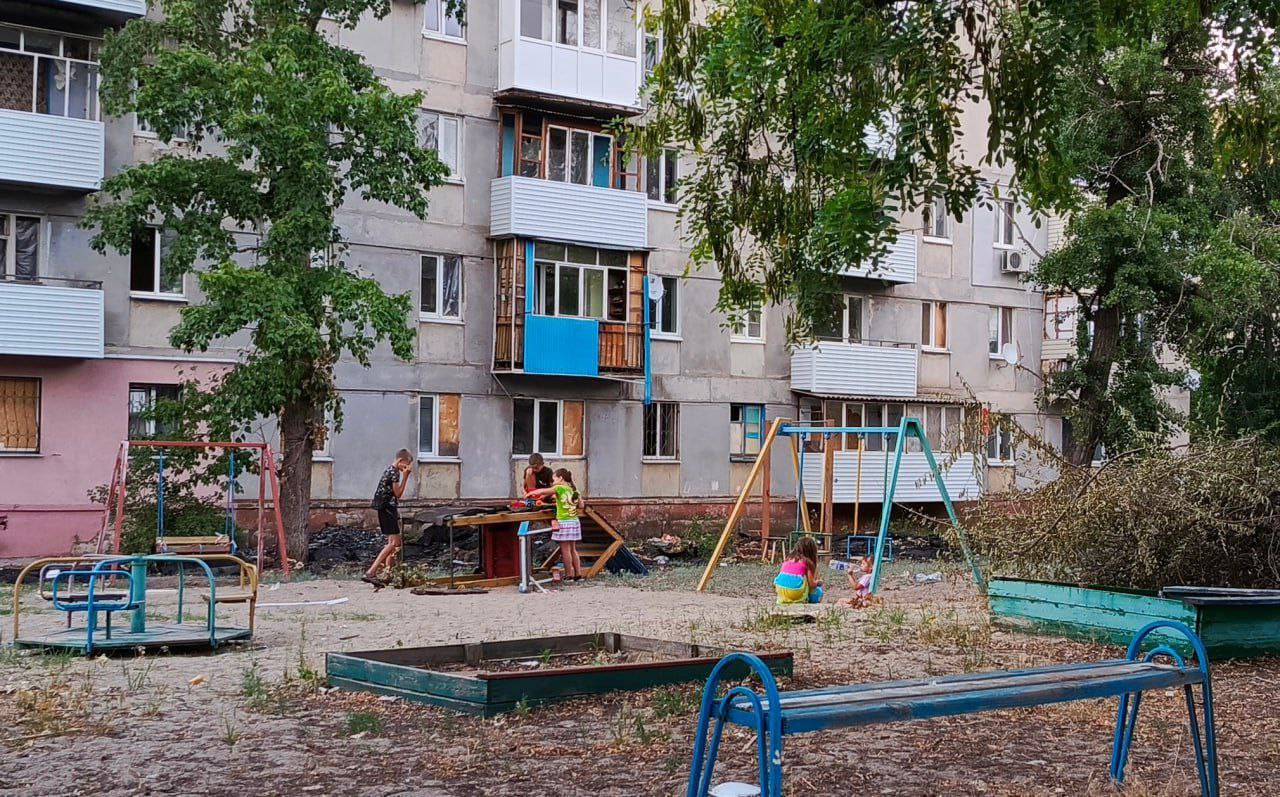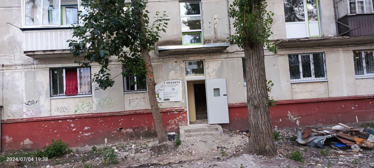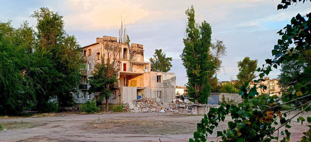 Третье фото показывает жилой дом, фасад которого поврежден. Окна разбиты, стены покрыты трещинами и надписями. На некоторых балконах висят украинские флаги, которые напоминают о том, что этот город был и остается украинским, несмотря на оккупацию. Видно также новые двери, которые, вероятно, установили оккупанты.