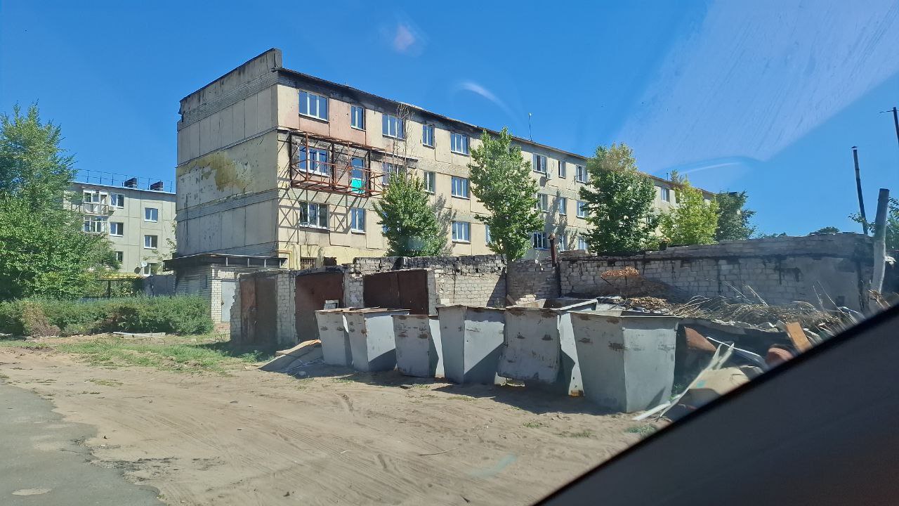 На других фотографиях также видны многоквартирные дома в плохом состоянии. Дороги вокруг домов ухожены, с многочисленными участками грязи и мусора. На переднем плане находятся мусорные контейнеры и остатки разрушенных построек, что создает еще более пасмурный пейзаж.