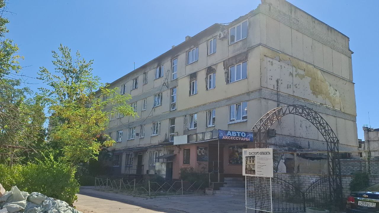 На фото виден многоквартирный дом, который находится в заброшенном состоянии. Фасад здания обшарпан, части стен обрушены, а окна выглядят поврежденными. На первом этаже расположены коммерческие помещения, среди которых магазин автоаксессуаров, который так нужен людям, живущим в тяжелейших условиях.