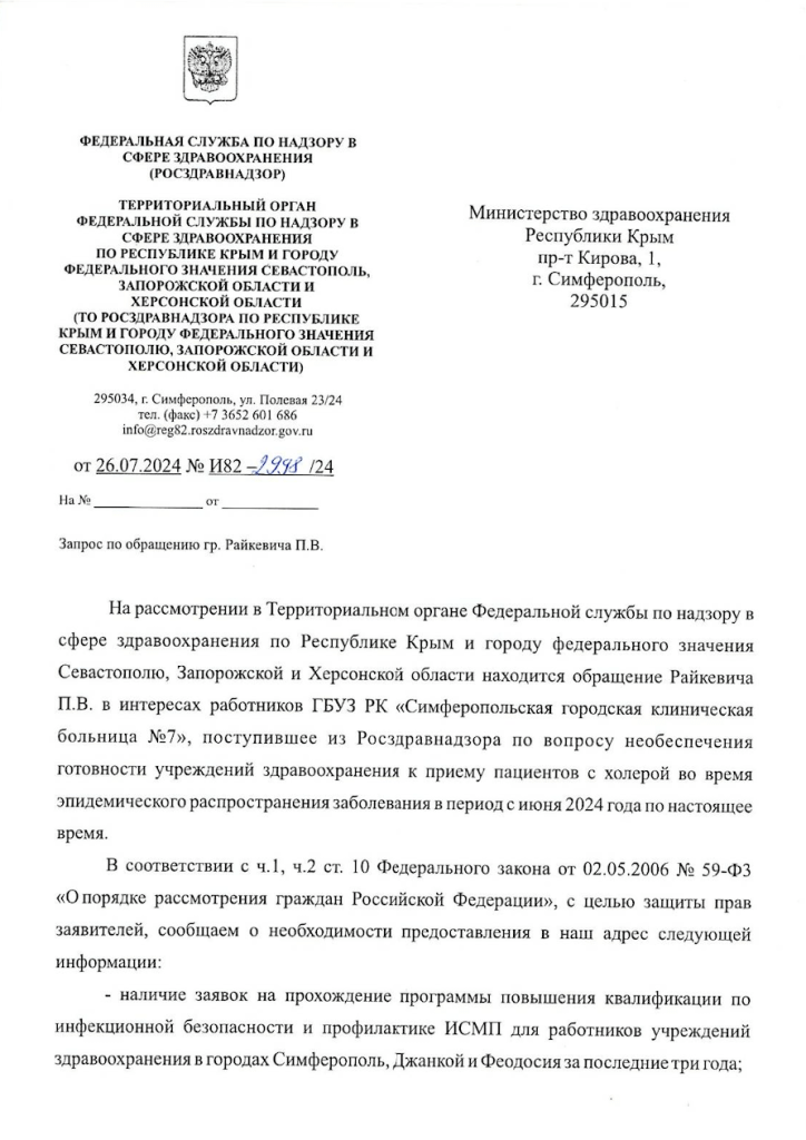 Обнаруженные документы содержат запросы в росздравнадзор с требованиями проверить обеспечение больниц медикаментами и индивидуальными средствами защиты. Однако, как показывают данные, в больницах Крыма не было достаточного количества средств индивидуальной защиты, а также курсов повышения квалификации для медицинского персонала по профилактике инфекций, связанных с оказанием медицинской помощи.
