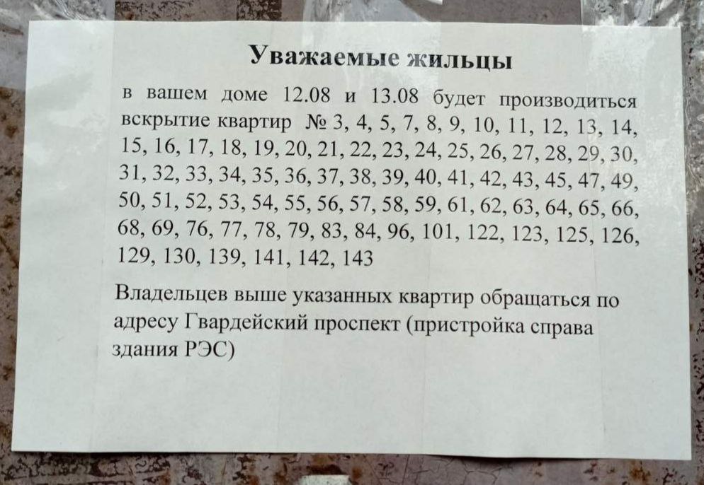 Текст объявления призывает владельцев этих квартир обращаться по адресу: Гвардейский проспект, пристройка справа здания РЭС.