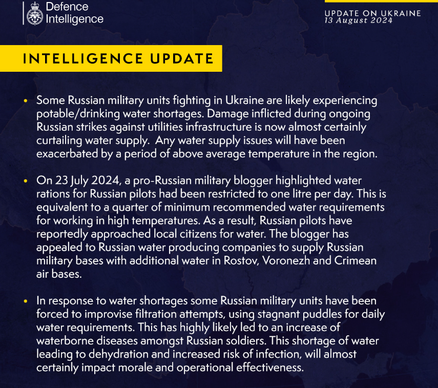 Британская разведка подчеркивает, что нехватка воды и связанных с ней заболеваний может иметь долгосрочные негативные последствия для российской армии, усугубляя и без того сложные условия на фронте.