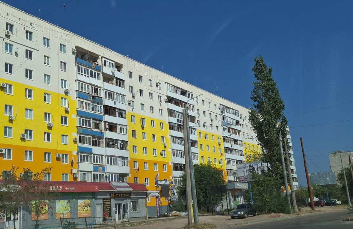 На верхних фотографиях действительно изображен Северодонецк, а именно дома по проспекту Гвардейскому 20, 40 и 55. Судя по снимкам, этим зданиям покрасили фасады, создавая видимость восстановительных работ.