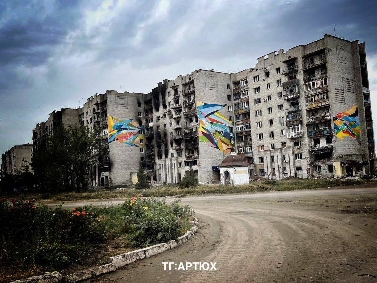 На первом фото мы видим несколько многоэтажных домов, которые подверглись значительным разрушениям. Фасады обожжены, многие квартиры выгорели, что свидетельствует о серьезных боевых действиях в этом районе. Среди этого хаоса можно заметить яркие настенные рисунки, которые контрастируют с серостью и опустошенностью города.