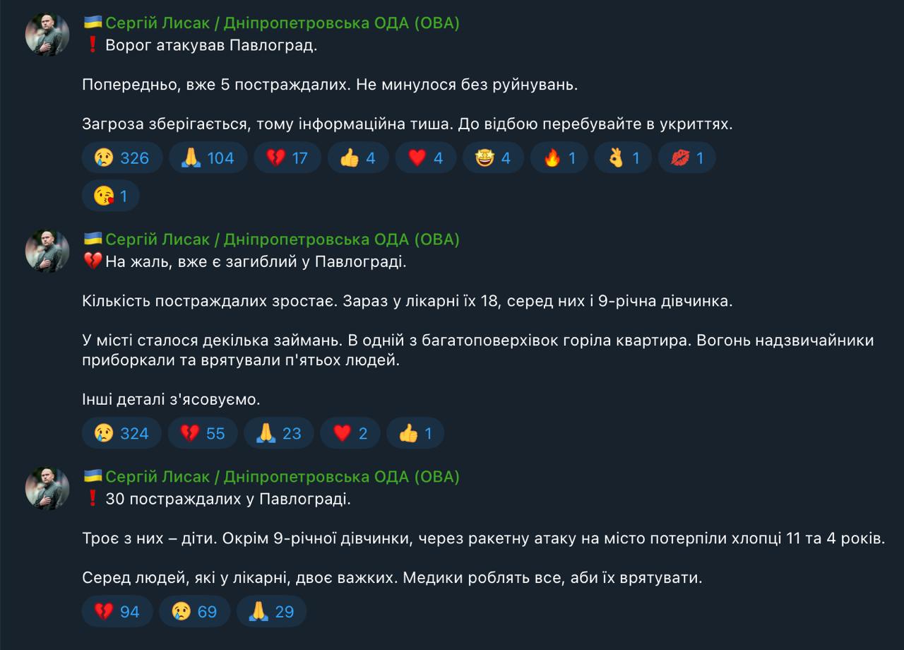 Позже он написал: "30 пострадавших в Павлограде. Трое из них – дети. Кроме 9-летней девочки из-за ракетной атаки на город пострадали ребята 11 и 4 лет. Среди людей, которые находятся в больнице, двое тяжелых. Медики делают все, чтобы спасти их".