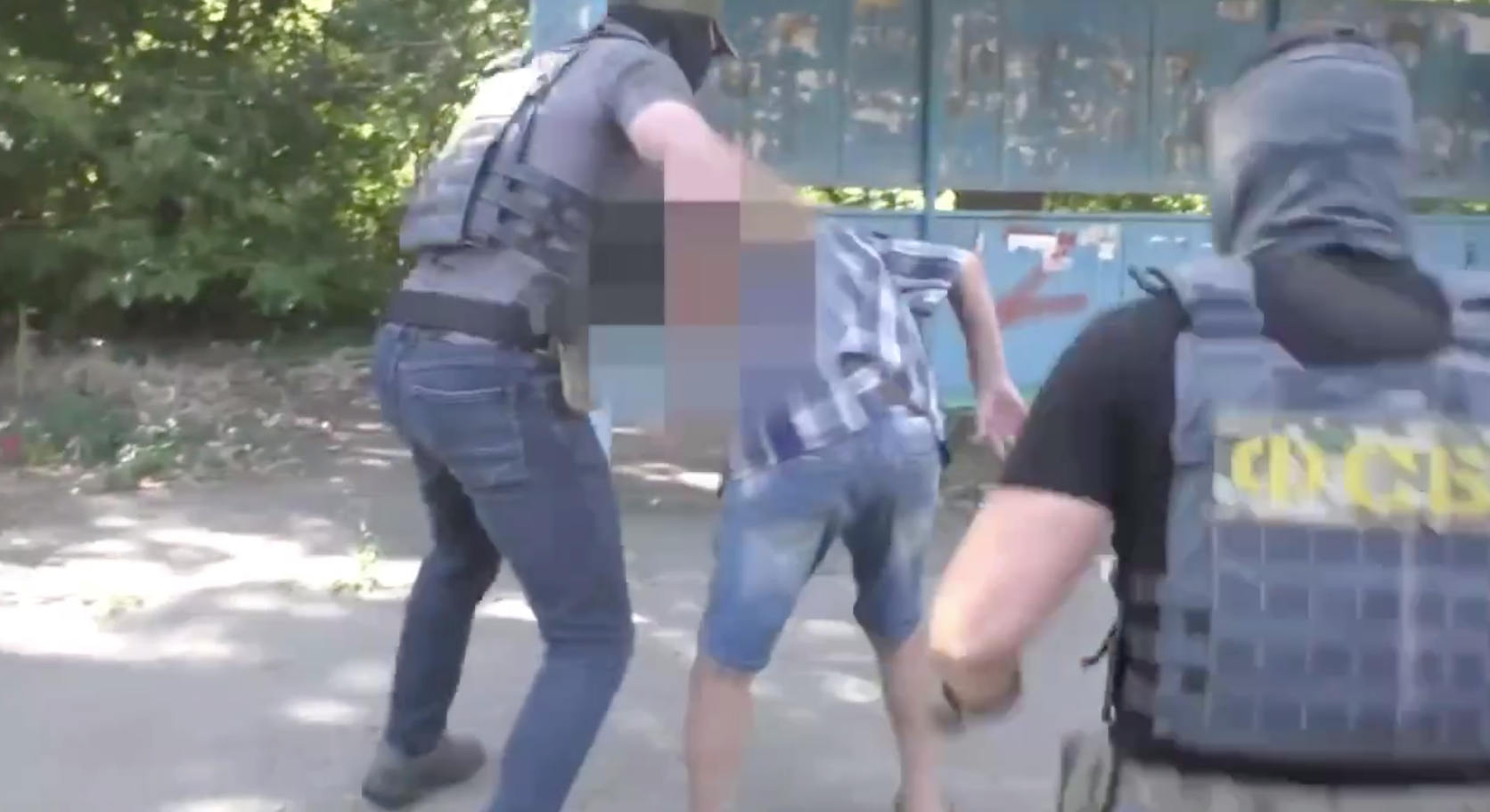 Процесс "задержания" мужчины сотрудниками ФСБ был снят на видео. Лицо "задержанного" не показано, но судя по кадрам, это пожилой мужчина. Не исключено, что видео постановочное и снято для запугивания местного населения.