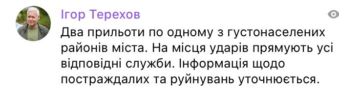 "Два прилета по одному из густонаселенных районов города. На места ударов направляются все соответствующие службы. Информация о пострадавших и разрушениях уточняется", - сообщил мэр.