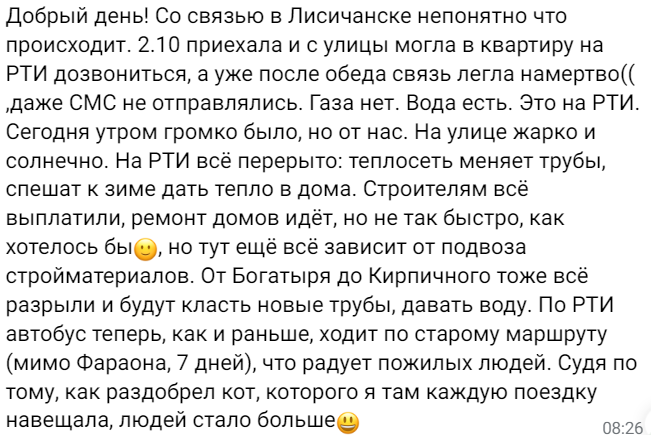 "Со связью в Лисичанске непонятно что происходит. 2 октября я приехала и могла дозвониться с улицы на квартиру, а уже после обеда связь пропала полностью, даже СМС не отправлялись. Газа нет, но вода есть - это на РТИ", - рассказывает одна из жительниц.