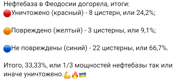 В то же время "глава" Феодосийской оккупационной администрации Игорь Ткаченко заявил, что жители города начинают возвращаться после эвакуации. Он добавил, что режим чрезвычайной ситуации техногенного характера был отменен, хотя ликвидация последствий пожара продолжалась еще несколько дней.