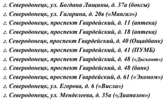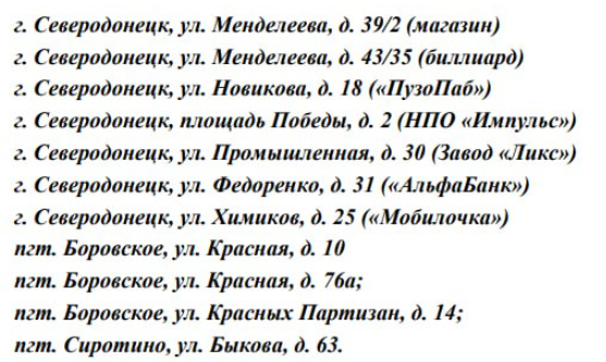 В список вошли аптеки, банки, магазины и квартиры на улицах: Богдана Лищины, Гагарина, Егорова, Менделеева, Новикова, Промышленная, Федоренко, Химиков, Красная, Быкова, проспект Гвардейский.