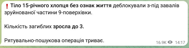 По данным Харьковской областной прокуратуры, среди жертв - 15-летний подросток, чье тело было найдено под завалами разрушенной части 9-этажки, передает Час Пик.