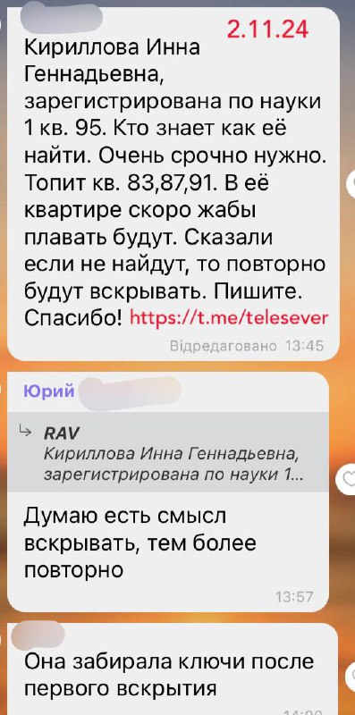 "Срочно появиться и дать доступ в квартиры на Курчатова, 17 91 и 95. Топит весь подъезд. За неявки будем вскрывать", - пишут встревоженные жители в комментариях.