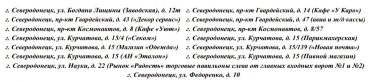 Среди указанных объектов - кафе "У Каро" и "Уют" на проспектах Гвардейский и Космонавтов, авиа- и ж/д кассы, а также ряд коммерческих помещений на улице Курчатова, включая парикмахерскую, магазин одежды и офис агентства недвижимости. В список попал также рынок "Радость", где проверке подлежат торговые павильоны у главного входа.