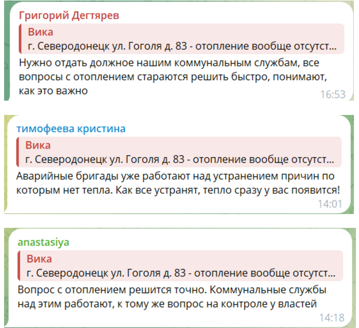 Один из пользователей пишет: "Гоголя, 83 – отопление вообще отсутствует", а другие добавляют, что ситуация аналогична в домах по адресам Донецкая, 38 и Гагарина, 51. По словам жителей города в их квартирах мороз, и они вынуждены замерзать, не получая необходимой помощи.