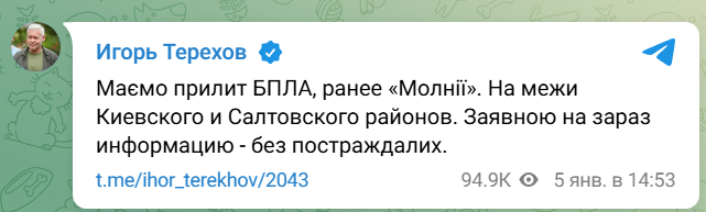 Сегодня, 5 января, Харьков вновь оказался под атакой российской армии. Мэр города, Игорь Терехов, сообщил, что российский беспилотник нового типа - "Молния" - нанес удар по Харькову.