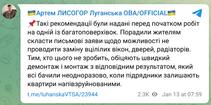Глава Луганской ОВА Артем Лысогор сообщил о новом витке абсурдной ситуации в оккупированном Северодонецке, где российские "строители" сами рекомендуют местным жителям отказываться от предлагаемых "ремонтных работ".