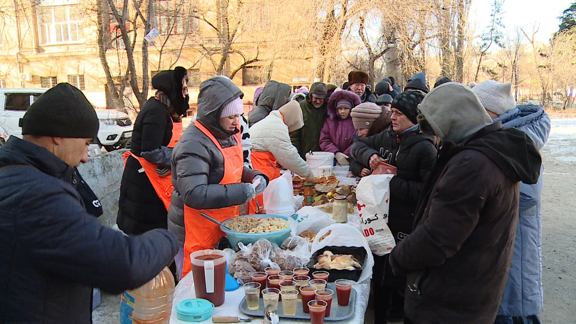 Волонтеры привезли 200 литров гречневой каши с вегетарианской колбасой. На улице был обустроен импровизированный пункт раздачи, куда выстроились десятки пожилых людей. Для каждого маленькие пакетики насыпали горячую гречку с колбасой, давали хлеб и один банан.
