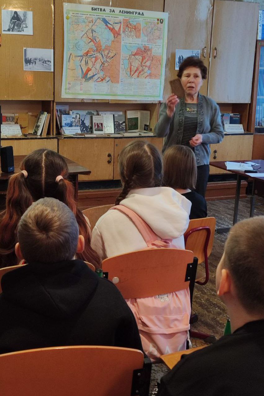 В школьной библиотеке была организована выставка книг и материалов, посвященных блокаде Ленинграда. Также учителя-коллаборанты провели музейные уроки, на которых ученикам показывали экспонаты, "помогающие погрузиться в атмосферу того времени". Однако дети и без этих уроков ежедневно переживают последствия современной войны – очереди за гуманитарной помощью, обстрелы, разрушенные дома.