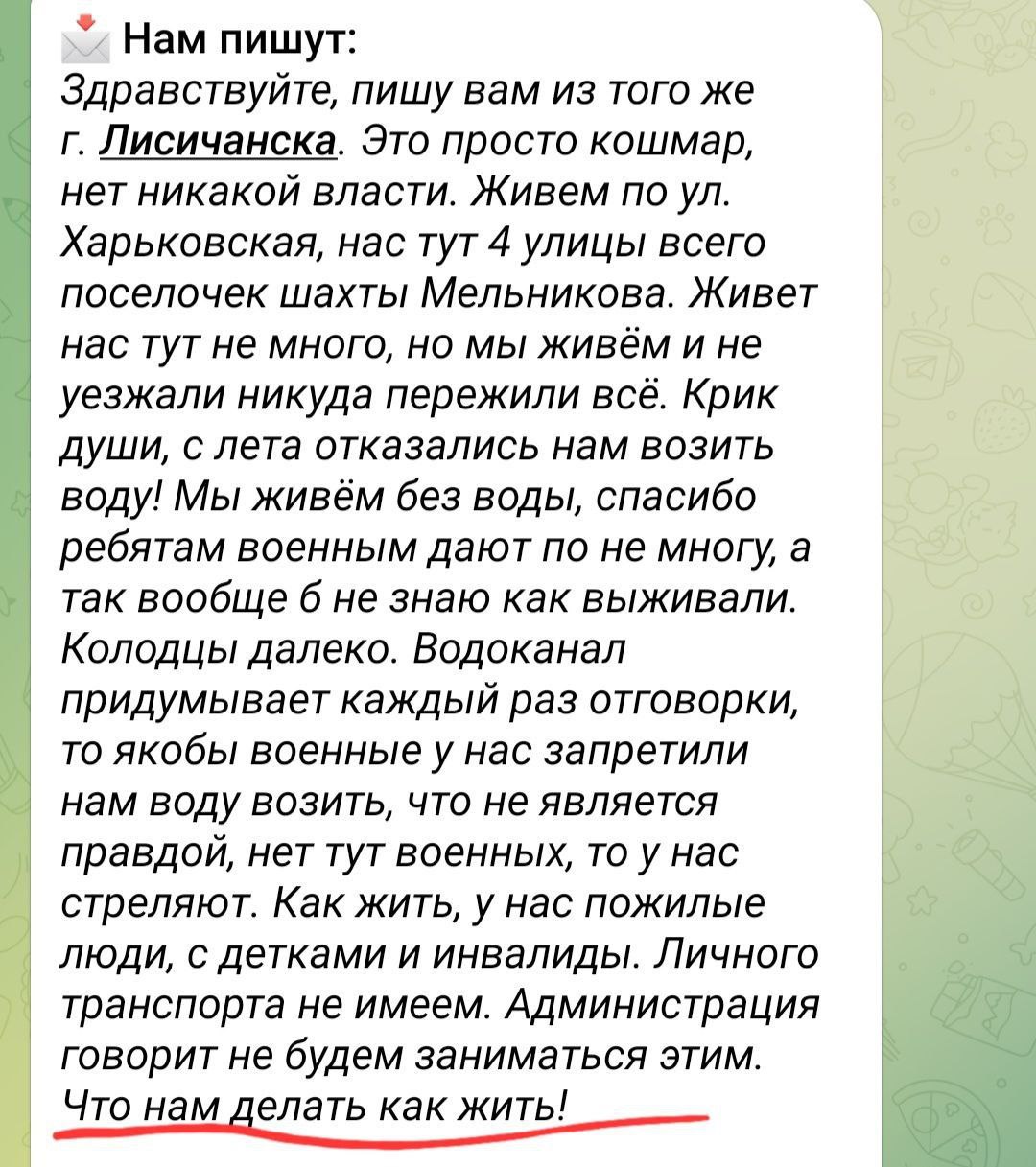 "Мы живем без воды. Спасибо военным, что дают хоть немного, иначе не представляем, как бы выживали. Колодцы далеко, а транспорта нет", - пишет местная жительница.
