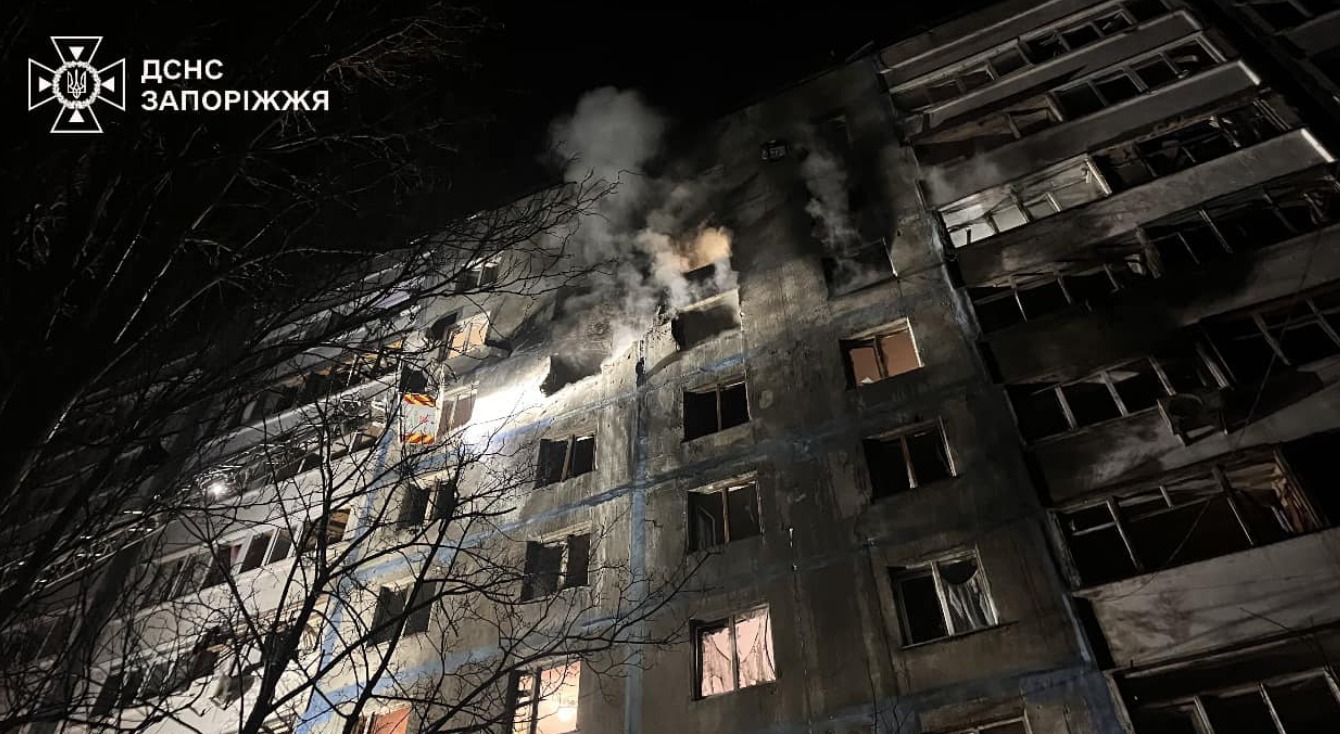Поздно вечером 27 февраля российские оккупационные войска атаковали "шахедами" Запорожье. Вражеский беспилотник попал в многоэтажку, в результате чего начался пожар. Есть пострадавшая.