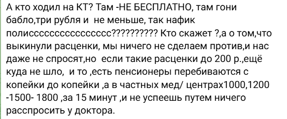 Один из местных жителей отметил, что некоторые услуги уже давно оказываются только на платной основе: "А кто ходил на КТ? Там - не бесплатно, три тысячи рублей и не меньше".